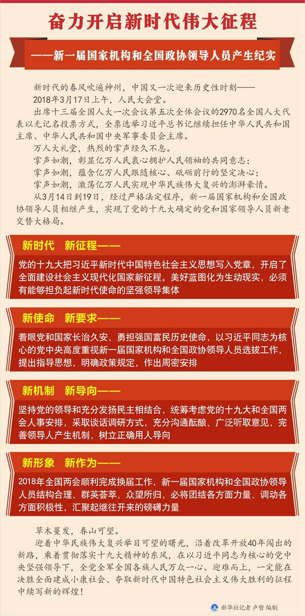 新形象 新作为——2018年全国两会顺利完成换届工作,新一届国家机构和全国政协领导人员结构合理、群英荟萃、众望所归,必将团结各方面力量、调动各方面积极性,汇聚起继往开来的磅礴力量